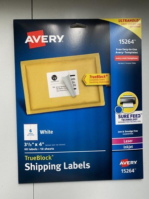 [This review was collected as part of a promotion.] The Avery TrueBlock Shipping Labels, Sure Feed(TM) Technology, Permanent Adhesive, 3-1/3" x 4", 60 Labels work perfectly for shipping my stained glass items. Easy to select Avery for my laser printer, get a professional looking label that will stick to wrapping paper or tape.