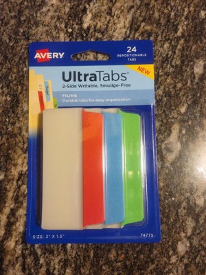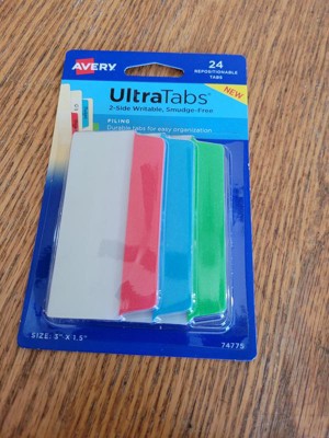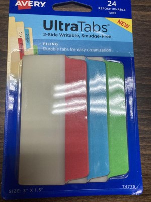 [This review was collected as part of a promotion.] UltraTabs 2-sided writable, smudge-Free filing tabs are really nice. They come 24 in a package are are also repositionable in case you need to move them to a different location on your file folder or to a different file all together. They're very durable and come in 3 different colors to keep organized.
