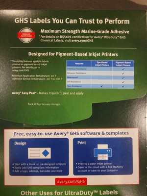 [This review was collected as part of a promotion.] The Avery Ultra-Duty GHS Chemical Labels for Pigment Inkjet Printers, Waterproof and UV Resistant work exactly as described and have held up very well in the laboratory. It comes in extremely handy when labeling all of our hazardous chemicals.