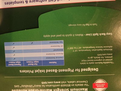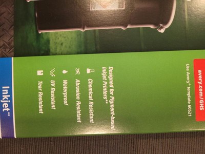 [This review was collected as part of a promotion.] Avery GHS Chemical Labels are the best that I have found for durable signs that last outdoors for years! If you go to the Avery website, it will tell you what type of printer you need to use with these labels. They will not work with just any inkjet printer.