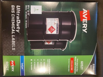 [This review was collected as part of a promotion.] The Avery UltraDuty GHS Chemical Labels for Pigment Inkjet Printers are sold in a package of 50 waterproof and UV resistant 8-1/2 x 11 inch labels (number 60521). The labels are large and durable, perfect for large containers when you need strong labels. It includes a great 100% satisfaction guarantee of a replacement if there are any problems with the labels.
