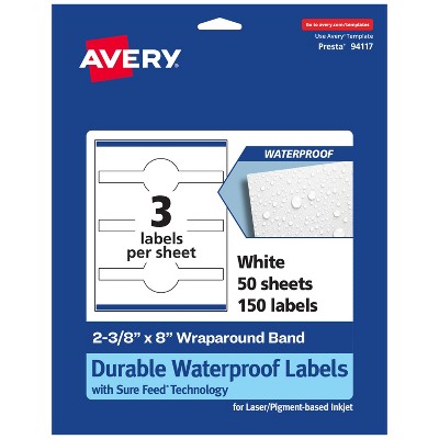 Bring your cosmetic labels, food labels, jar labels, and more to life with customizable Avery Outdoor Waterproof 2-3/8" x 8" Wraparound Band Labels. Designed for quality, durability, and standout presentation, these sticker labels are built to handle it all. The waterproof white film resists moisture, keeping your personalized labels vibrant and easy to read in any setting. Built for lasting performance, the material also resists tearing, UV rays, extreme temperatures, chemicals, and oils—making it a dependable choice indoors and out. Packed with thoughtful details, Avery labels deliver professional results and reliable performance. For a strong, lasting hold, permanent Ultrahold adhesive keeps your custom label stickers in place without lifting or peeling, while TrueBlock technology hides anything underneath, for a polished, professional look. Sure Feed technology reduces jams or misalignments by creating a more reliable feed through your printer. Optimized for laser printers, each 8.5†x 11†sheet produces crisp text and vivid colors that last. Perfect for custom waterproof stickers, bottle labels, freezer labels, product labels, and more, these labels deliver the versatility and performance you can rely on.