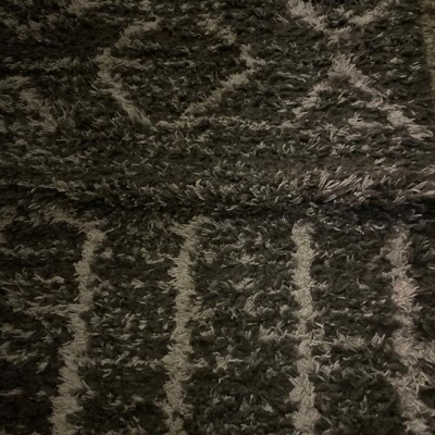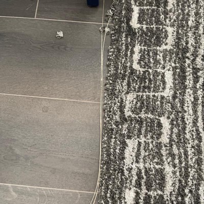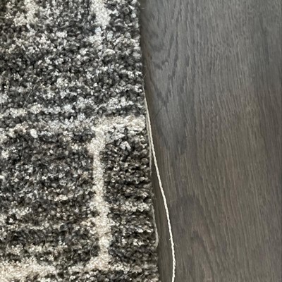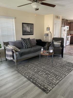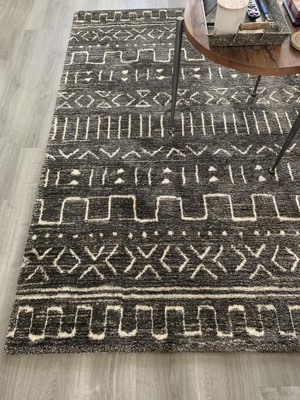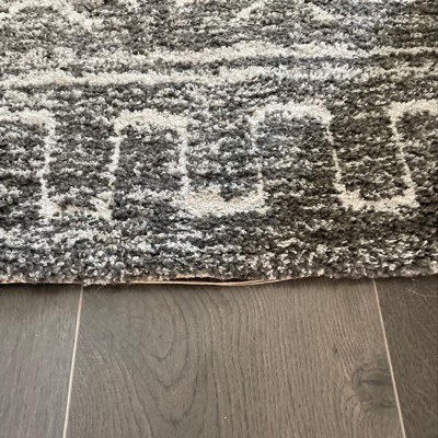 A: The rug is primarily gray with a geo-inspired design in white.