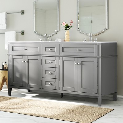 This 60" bathroom vanity is crafted with a solid natural wood frame and premium HDHMR engineered wood panels, providing exceptional strength, durability, and moisture resistance for long-term use in humid bathroom environments. Hand-finished using an 8-stage Sherwin-Williams painting process, it offers enhanced protection against wear, water exposure, and daily use. The stain-resistant white quartz countertop features dual rectangular ceramic sinks and a matching backsplash, delivering a high-end, non-porous surface that resists moisture, stains, and fog while protecting walls from water damage. Designed for modern homes, the vanity includes smart-closing hinges, high-density sound-resistant drawers with generous storage capacity, and straight legs with adjustable levelers to ensure stability on uneven floors. Made from 100% recyclable, eco-certified materials, this vanity combines refined design, practical functionality, and long-lasting performance for contemporary bath spaces.