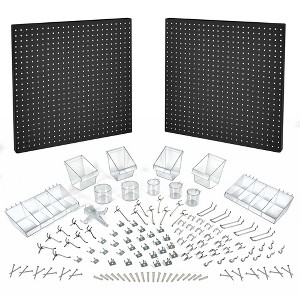 Organize any space with Azar Displays 125-Piece Pegboard Organizer Kit. Keep your work or craft space neat, clean and items easily accessible. Azar's pegboard panel set comes with pegboard wall panels, hooks, screws, bins, and cups to hold and organize any supplies in your home, workplace, garage, shed, basement, craft room, play room, dorm room, storage room, or retail environment. The pegboard organizer kit includes: 2 pcs. 24 x 24 perforated pegboard wall panel , 2 pcs. divider bin trays, 6 pcs. dividers for divider bin trays, 3 pcs. 3 dia. cups, 2 pcs. 4 dia. cups, 4 pcs. small display bucket, 1pc. open eyeglass holder, 10 pcs. metal j-hooks, 20 pcs. metal u-hooks, 30 pcs. metal prong hooks, 8 pcs. 2 galvanized metal hooks, 8 pcs. 4 all-wire galvanized hooks, 5 pcs. 4 metal loop hooks, & 20 pcs. mounting hardware screws and mollys. It's never been easier to tackle those organizational projects such as crafting, sewing, ribbons, scrapbooking, Cricut, art supplies, tools, hardware, children's toys, nerf game and accessories, and loose items. Simply attach the pegboard panels to any flat surface, hang the hooks and accessories however best suits your needs and you now have a custom peg wall to keep your stuff neat. The plastic pegboard panels are made of high impact styrene so they are strong, sturdy and durable. Choose from many panel colors available. Azar's organizer kit is the perfect solution to help you declutter and get organized. Sold in Multiples of: 1 Set Panel Thickness: 0.125 Combined Panel Size: 48W x 24H Material: Plastic Pegboard Panels Includes: Pegboards, Pegboard Accessories and Hardware