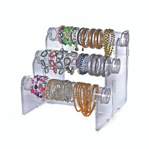 This three-tier acrylic bracelet display is the perfect jewelry holder for your accessories. These jewelry displays are ideal for keeping your bracelets organized and your dresser clutter free. Place in your bedroom, bathroom, closet or make up counter. If you are looking for a great way to display your accessories in a neat and organized way, this triple tier acrylic jewelry holder is just for you! Sold in Multiples of: 1 Material: Acrylic Overall Size: 12W x 10.5D x 11H Bar Size: 12W x 2 Dia Color: Clear