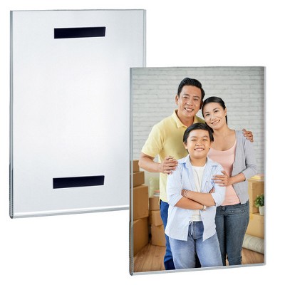 These premium Acrylic Block Frames from Azar Displays are the perfect blend of elegance and durability to showcase your signage or artwork in a stunning visual impact wherever they're displayed. Crafted from high-quality, crystal-clear acrylic material, these frames offer a modern and sleek alternative to traditional sign holders. Each photo frame has 4 magnets on the corners to hold the acrylic together. Your graphic or picture fits securely inside without moving or sliding. Easy to use, simply pull apart the acrylic panel and one side of the frame will detach from the other. Then insert a picture or graphic and reattach the acrylic pieces together so that your photo will be held securely. The photo holders stand on their own on a tabletop, shelf, counter, or mantel. Each base has 4 rubber bumpers to prevent from sliding or scratching any surface. The transparent design allows your photos, pictures or artwork to stand out. The solid acrylic block frames can be used in boutiques, museums, trade shows, hotel lobbies, restaurants, retail stores, schools, at work or at home. Sold in multiples of 1.