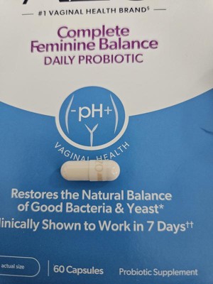 [This review was collected as part of a promotion.] A daily probiotic to help balance your feminine health. The package comes with two bottles each containing 30 capsules each. One per day is all you need and it claims to clinically work in 7 days. Helps to restore natural balance of good bacteria and yeast.