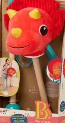 B. toys Hop 'n' Ride Tommy Triceratops - Plush Dinosaur Hobbyhorse with Sounds: Polyester & Wood, Toddler Gross Motor Skill Toy