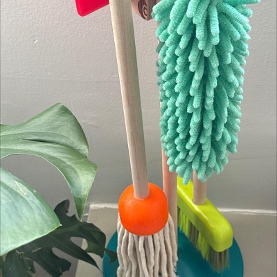 - Includes: This pretend play set comes with a mop, broom, brush, dustpan, duster, and a storage stand.