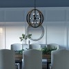 The Babaton orb pendant combines industrial and modern farmhouse elements into one unique design. Ten slim candelabra sleeves extend from a center globe in a sputnik-inspired design, finished in old black. Alternating distressed wood-like orbs surround the fixture, adding a rustic element.