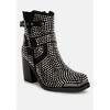 These luxurious ankle boots feature a refined classic style, enhanced by stud embellishments and harness details that add a touch of edginess. With a convenient side zipper and comfortable block heels, along with soft insoles, your feet will feel great in this microfiber boot, no matter where you go. Type: Boots Upper Material: Microfiber Outer Sole: TPR Closed Square Toe Belt Buckle Detail Metallic Accent Detail Side Zipper Block Heels  Harness Detail Stud Embellishments Heel Height: 3.5 inches RCSH5224