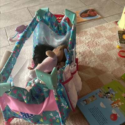 BABY ALIVE: DELUXE DOLL PLAY YARD - GREEN, PINK, HEARTS - Baby Alive Deluxe Doll Play Yard with bright, fun prints is made with powder coated steel tube frame and thick durable polyester material. This cute Pack and Play includes some unique features like; removable multi position canopy, double side mesh pocket for accessories and real spinning back wheels for easy mobility. With Mesh on both sides you can watch your Baby Doll Sleep or Play and it’s large enough to fit multiple Dolls. When it’s time for sleep-overs the Baby Alive Doll Play Yard is perfect for travel, it folds up and fits into it’s own matching carry bag! This travel Play Yard will comfortably fit Dolls up to 18 inches.