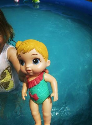 [This review was collected as part of a promotion.] My daughter loves this doll for water play in the pool. She is very cute and there is no hair to get all weird like our other dolls she likes to bring in the water. Seems to be mostly dry not long after playing with it. It's been great for imaginative play this summer.