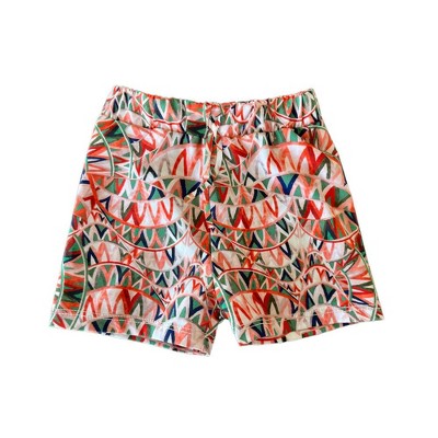 Made in the USA swim shorts for boys in red geometric color.