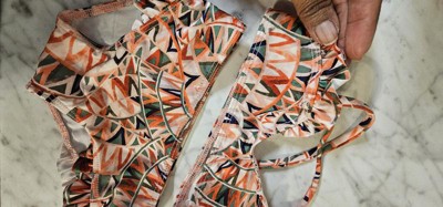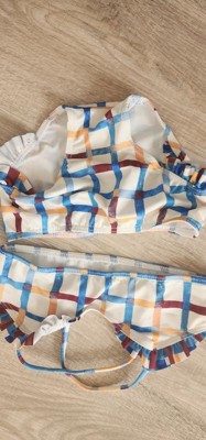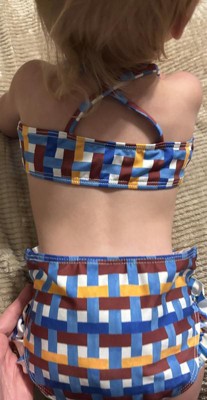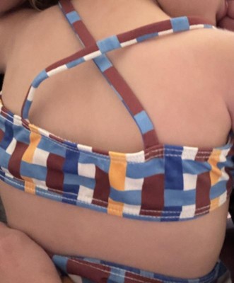 This is a cute pattern and an interesting bikini design with the crinkles and the laced edge, but I would never expect this to be for a toddler or an infant, which is exactly what it is. This thing is so small that the age of the child wearing it, I feel should definitely just be wearing a shirt and a swim diaper, not a bikini. The top is basically a bra, and no toddler should be wearing that, in my opinion. But even if I wanted my child to wear something like this, it's so incredibly small it would better fit an INFANT than a toddler. There's no way I'd be able to wiggle this over the top of my toddler. It's too small and tight.