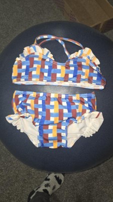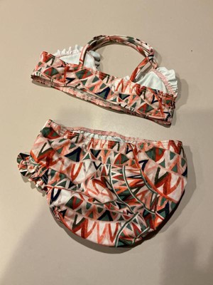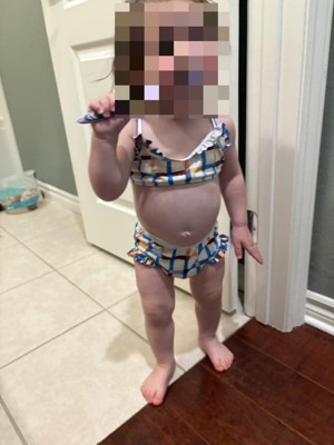 I have a 14 month old daughter. It was hard to get this cute top on her as she squirmed around. Once I got it on, it looked cute but the top was a little big. I thought the ruffles on the top were a bit much for a 14 month old. The bottom fit well. This bikini washed well and is made out of nice material.