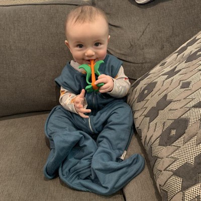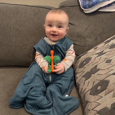 My 7 month old loves this teether. He likes chewing on the head of the toothbrush & the wings. It’s sturdy but not too heavy. The handles are nice so you can attach clips to not get thrown. And it’s a cute design!