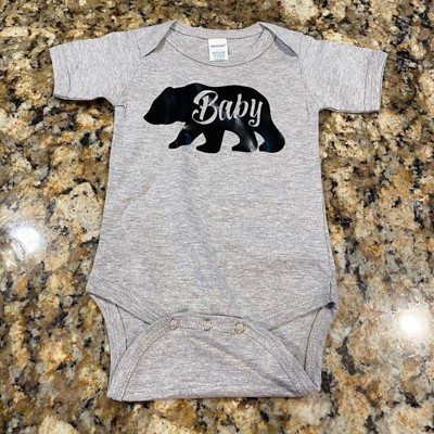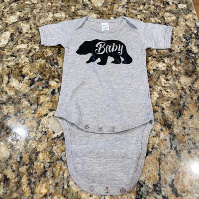 [This review was collected as part of a promotion.] This baby bear onesie is super cute and gender- neutral. The black bear screen print is very shiny. The shirt seems a little stiff compared to another onesie that I bought from this company. I bought size 6 months and it seems to run a little small compared to other onesies that I have in the same size. I would definitely size up.