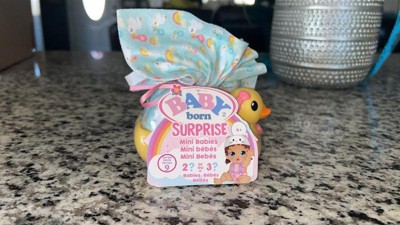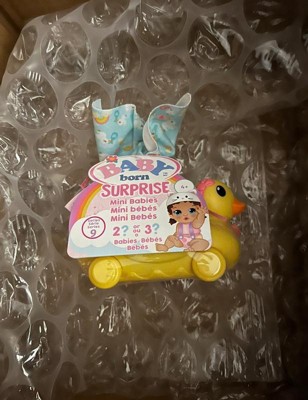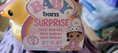 Unwrap each adorable capsule to find collectible mini baby dolls inside. How many babies will you get? Inside you'll find a cute, snuggly swaddle themed around preschoolers day to evening activities and 2 or 3 mini babies. Each set of mini babies includes a ducky pull toy that the dolls can ride inside. Collect multiple ducks, and they can be linked together to create a ducky pull toy parade! BABY born Surprise Mini Babies Series 9 includes 2 or 3 babies, soft fabric swaddle, blanket, ducky pull toy, and collector's guide with birth certificate. Collect all 7 cute sets of babies and adorable swaddles. A total of 15 different babies to collect in a variety of skin tones, eye colors and facial expressions.