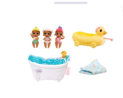[This review was collected as part of a promotion.] This adorable mini doll set is perfect for bath time fun! My child loved unboxing the tiny babies and playing with them in the tub. The duck stroller floats well and adds to the excitement. Great quality, no weird smell, and encourages creative play. A fun and safe toy for little ones who love water play!