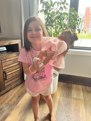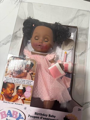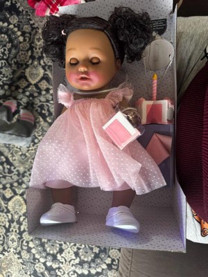 [This review was collected as part of a promotion.] The cutest baby doll with so many fun accessories! My daughter was thrilled to unbox a doll that looked like her. The birthday doll is available in different skin tones and has a cake, a birthday hat, a face towel, and a cute pink dress. When you "feed" your doll the cake piece (which you're supposed to place in the freezer for 30 min) her face becomes messy, and you can then clean her face with the included towel dipped in warm water. It's a cute idea, but the messy cake looks more like smeared lipstick, and if it's cold outside, her face shows the marks. The eyes open and close, which my daughter likes so that she can put her baby to sleep. Overall a cute doll with fun accessories!