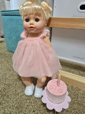 [This review was collected as part of a promotion.] BABY born Birthday Baby Doll - Ava is so adorable and life like! She comes dressed for her party with a pink dress, bows in her hair and a birthday hat. Just feed her the included cake from the freezer and her face color changes from clean to dirty. And to get her clean again, use the included napkin dipped in warm water and wipe her mouth to remove the color change. So life like, you can lay her down and her eyes close. My little girl absolutely loves this doll!