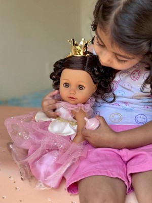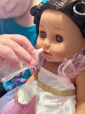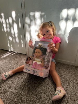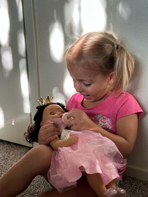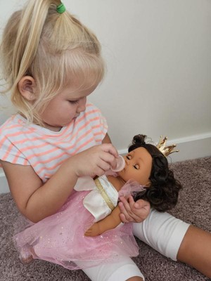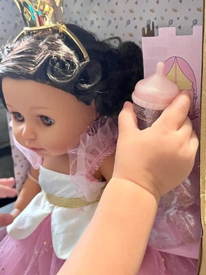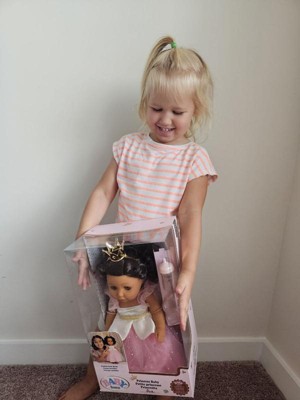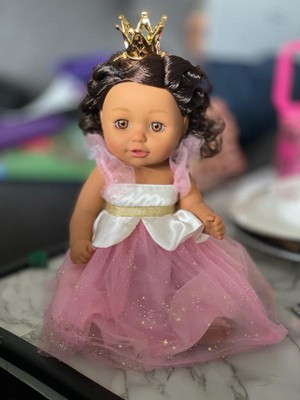 [This review was collected as part of a promotion.] My baby loves her doll. The packaging is super adorable but it is a little hard to open up. The doll I would say is the perfect size for kids not too small not too big. I fell like she is super cute, adorable and her hair is super cute. It includes a crown, the baby bottle and the dress also the shoes. She is able to close her eyes like she is sleeping when laid down also.