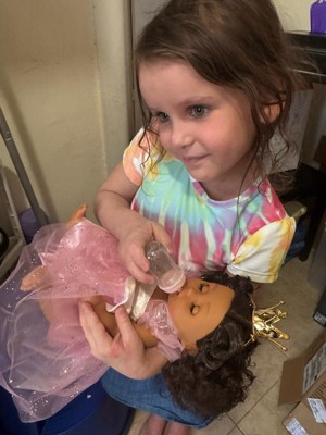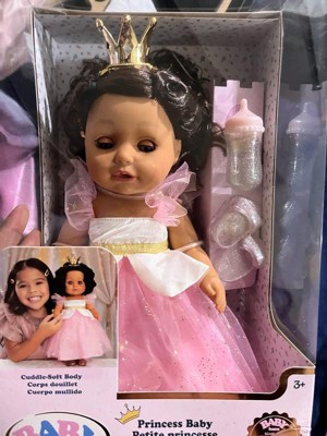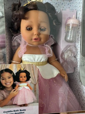 [This review was collected as part of a promotion.] I love how the body of Princess Baby is soft to the touch and cuddly. She is wearing a beautiful dress, a tiara, and a pair of sparkly slippers. There is also a baby bottle included. My daughter absolutely loves playing with and feeding her. Baby born has gorgeous soft brown hair, realistic brown eyes, and eyelids with long eyelashes that open and close.