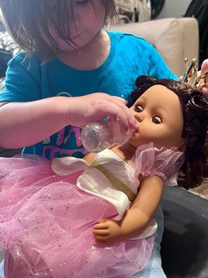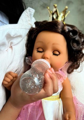 [This review was collected as part of a promotion.] My daughter is obsessed with. The doll is very cute and details are very beautiful. The dress, the crown, bottle with sparkles, the shoes very pretty. The eyes are closing automatically when the doll lays down.