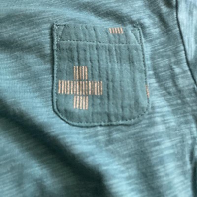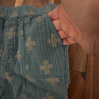 [This review was collected as part of a promotion.] Super cute baby boy outfit. The teal blue with tan cross pattern color make it a great transition to fall clothes. The light weight material would be perfect the warmer days but also could be paired with a sweater for cooler fall days. The pants have two deep pockets in the front. My baby is 6 months old but he is transitioning to 12 month clothes already; however, since this is a two piece set and the pants are wider, this fits him great right now. I received an incentive to write this review.