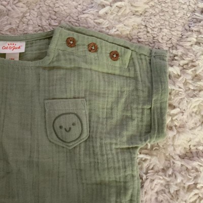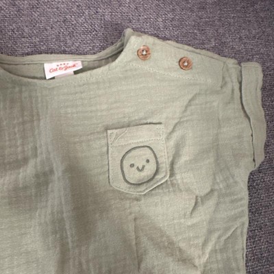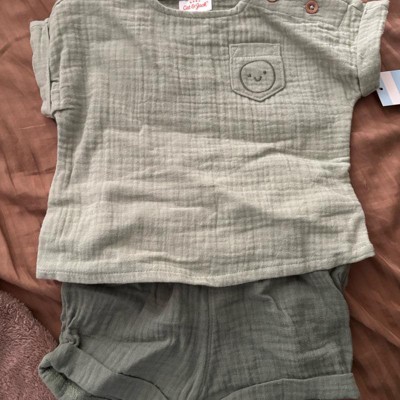 Add timeless cuteness and comfort to your baby's wardrobe with this 2-Piece Smiley Embroidered Pocket Gauze Shorts Set from Cat & Jack™. This gauze outfit set includes a short-sleeve blouse with folded detailing on short sleeves and a smiley chest patch pocket, along with matching bloomers for a cute, coordinated look. The shoulder snap closure on the tee ensures ease of wear, while the pull-on shorts feature a full elastic waistband for a snug fit. Crafted from 100% cotton fabric, this outfit set provides comfort and warmth for any outing.
