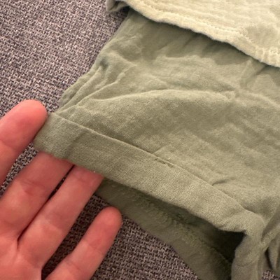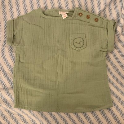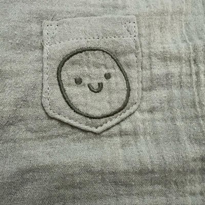 [This review was collected as part of a promotion.] This is such a cute little neutral outfit for boys. It honestly could even work for girls. It does fit oversized, my baby wears 18 month size and this 18 month outfit is definitely roomy on him. He’ll get a lot of wear. It’s 2 different shades of green but both muted. The fabric is a very soft muslin type of fabric. The smiley face is embroidered on and it’s adorable! I received an incentive to write this review.