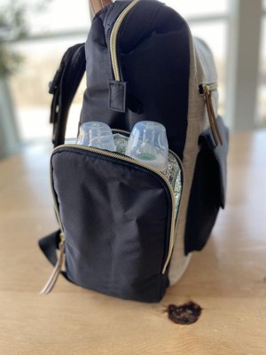 The Baby Brezza Martine Diaper bag incorporates fashion and function to help make diapering on-the-go easier. This Backpack Diaper bag features 9 pockets and a spacious interior for exceptional storage and organization. The diaper backpack is equipped with one exterior insulated side bottle pocket to keep bottles fresh. This bag also has a secure zippered interior pocket perfect for keeping important personal belongings safe, as well as five interior pockets to keep all of your baby’s essentials organized and easily accessible. The diaper bag includes a removable fold-up changing pad that makes diaper changes on-the-go a breeze. Made for optimal comfort this diaper bag has padded adjustable shoulder straps as well as a top carry handle and stroller loops that attach to the stroller for many carrying options. This stylish two-tone black and tan bag with gold detailing makes this the prefect accessory for every mom.