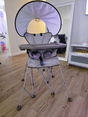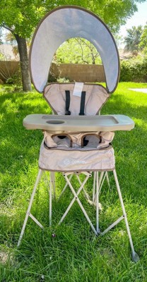 [This review was collected as part of a promotion.] We absolutely love the idea of a portable high chair. It is so easy to carry along to places. Very sturdy and comfortable for babies. Love the canopy for the shade