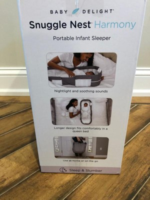 [This review was collected as part of a promotion.] The Baby Delight - Snuggle Nest Harmony Portable Infant Sleeper is amazing! I can not believe how perfect this is for the new mom. The mom inventor thought of everything. It can easily fit next to you in a queen bed and the carry handle is perfect for on the go. My all time favorite feature is the removable night light and sound unit! It is perfect to see your baby at night and to give them soothing sounds to help keep them asleep longer. It gives you peace of mind and baby their own sleep space. If you are looking for something for travel or just to keep your newborn near you get this!