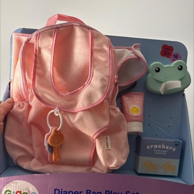 This Baby Doll Diaper Bag Play Set from Gigglescape™ adds imaginative play to your toddler's toy collection. This play set includes a diaper bag, toy keys, changing pad, toy wipes, play crackers, lotion bottle, diapers, bottle and more to provide countless hours of fun at home with their dolls. The diaper bag easily converts into a doll carrier for added fun. Designed to fit 14-inch baby dolls, this diaper bag is made from fabric and recommended for kids ages two and up.