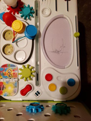 Inspire your child's curiosity with Baby Einstein's Curiosity Table Activity Station. From removable, spinning gears to color-discovery circuits and flashing lights, this two-sided art and science table will capture your little one's attention for hours. Made for hands-on learning and inspired by Montessori principles, this table introduces Science, Technology, Engineering, Art, and Math (STEAM) concepts through engaging play. Watch as the gears connect to make the light bulb turn on! Experiment with color using the mess-free "paint pots." Your little one will love investigating all the gadgets on this double-sided table that grows with baby from crawling to walking and beyond. Discover 65+ melodies and vocabulary in English, Spanish or French (with volume control high/low/off). Removable middle art panel can also be attached to the end of the table to make more space for baby's arts and crafts. Easily convert the table for floor play by removing table legs. A drawing art surface and a dry erase whiteboard leave plenty of room for big brother or sister to join in on the fun too. Pull up a seat - this play station is fun for parents, too. From the #1 Manufacturer of Baby Toys*, Baby Entertainment*, and Infant Toys* (*Circana, US Dollar Sales, Jan-Dec 24)