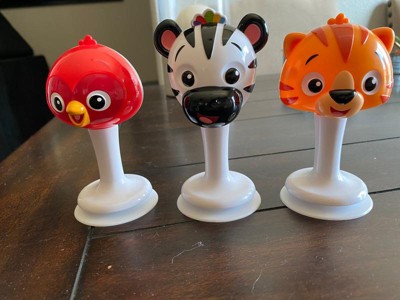 Add more jingles to mealtime, road trips or stay-in-place playtime with the Rattle & Jingle Trio from Baby Einstein. With suction cup feet, these music shaker pals stick to flat surfaces like tables and high chair trays. Each friendly face makes a different sound to keep your little one entertained. With transparent backs, your baby will love concentrating on the noisemaker tucked inside. Introduce cause and effect fun with a table toy thats easy to grab and go!