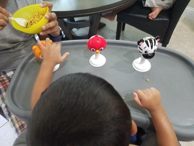 [This review was collected as part of a promotion.] Mealtimes just got fun! Our little guy plays with this rattle trio and has so much fun while he eats. I love how easy it is to clean. We also love that it is portable and can take it anywhere. It has 3 different sounds when it is shaken. He loves the sweet little animals- a bird, zebra and a tiger. The suction at the bottom holds really well and it is very durable for a rattle!! He's dropped it a bunch of times and I can testify that it is made with little ones in mind. Overall very cute and portable.