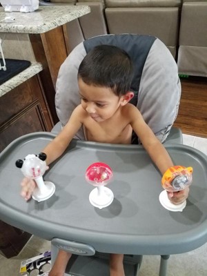 - Suction cup feet stick to flat surfaces like high chairs or restaurant tables