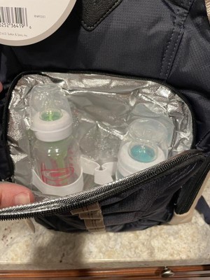 when i first saw this bag, i absolutely fell in love with the size of the front cooler. enough for THREE bottle of just about anything!!! although there is no side opening for wipes, there are 2 fairly large sized zip pockets on each side. it comes with a reusable changing pad and nice size space in the back for diapers. on the inside/main part of the bag, there is a zip pocket, 2 open slot pockets & a bigger open net pocket. however, with all that being said, its just not big/wide enough on the inside to make up for the space the drinks take when you put them in the front cooler. it cant hold much at all. its very compact. i think more width needs to be added in order to make up for the space of the bottles. KEEP THE BIG COOLER PART, thats the best feature of this bag, just make it wider/bigger on inside.