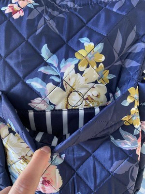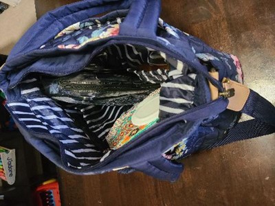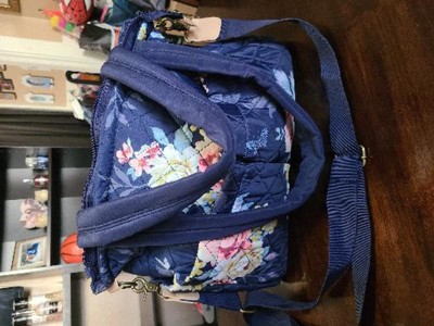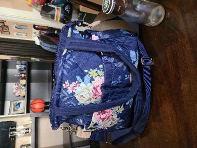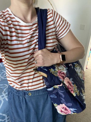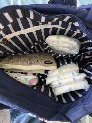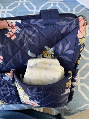 This is a great bag. It doesn’t necessarily look like a diaper bag but definitely has all the functions of one. It’s a great quilted design but is a navy floral that was perfect for a neutral option for the surprise gender baby (waiting until the birth to find out). I love that the carry straps are cushioned but then there is a messenger style strap too. There are pockets to spare and is a very sturdy design. I’m so happy with it!