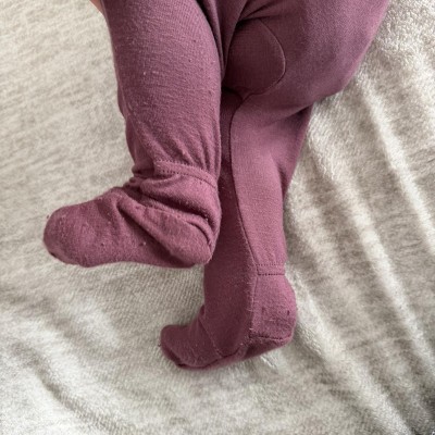 This was just a total miss at a knockoff on the nice soft sleepers. It is SO stretchy and thin. My daughter is average sized, 11 months and the 6-9 month is still too big for her. And it’s so oddly stretchy that her feet will come out of the little foot spots and get stuck inside the leg portion.
