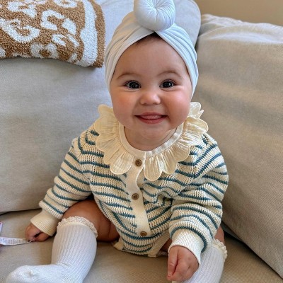Cozy up your baby in the cutest style with the 2-Piece Striped Peter Pan Collared Sweater Set from Cloud Island™. This two-piece outfit set features a Peter Pan collar sweater and a pair of shorts, both with a striped pattern, for an adorable look. The top has front buttons for easy dressing and changing, while the bottom has a full elastic waistband for a stay-put fit. Showcasing a knitted design, this clothing set makes a perfect gift for a little one in your life.