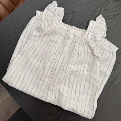 Add an adorably cute update to your little one's wardrobe by dressing them in the Striped Gauze Long-Legged Romper from Cloud Island™. This cream romper features an allover striped print and ruffled sleeves for a sweet look. Tailored from cotton-spandex blend fabric, the ruffle-sleeve romper offers stretchy comfort all day while the crotch snaps allow for quick diaper changes.