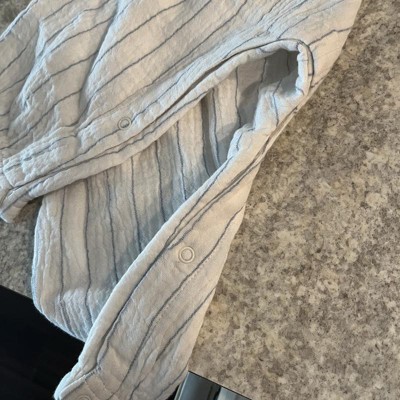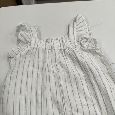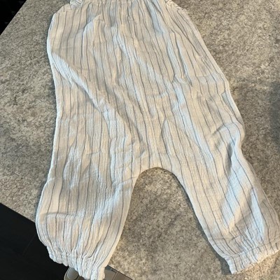 [This review was collected as part of a promotion.] This is the baby girls striped long leg romper by Cloud Island. This is a very lightweight gauze material that fits loose in the torso and the leg length is a capri. This is super cute and comfy. My girls is in 18M so I sized up to a 24M and the fit is perfect with room to grow. The blue pin stripe is on a white slightly off white background as opposed to cream. This is easy to get on and off as it just pulls over her head. This is a super cute romper at a really good price. I received an incentive to write this review.