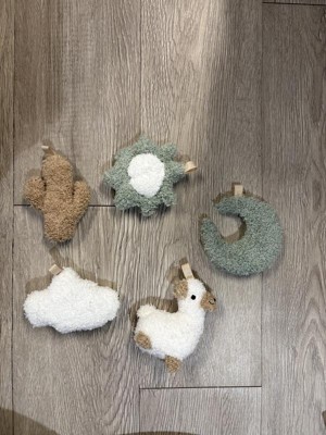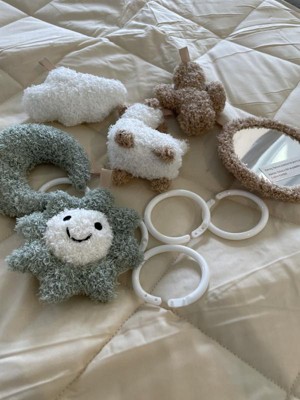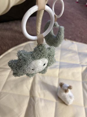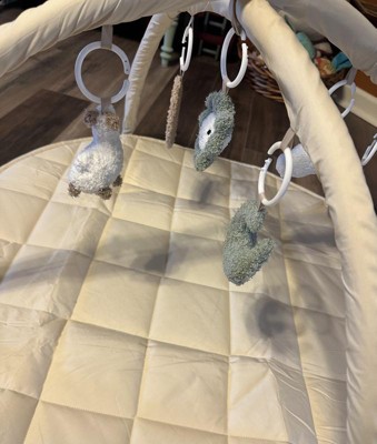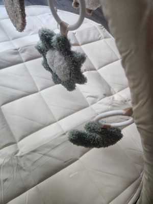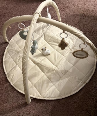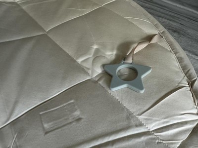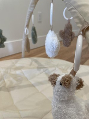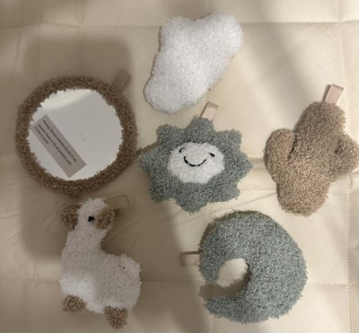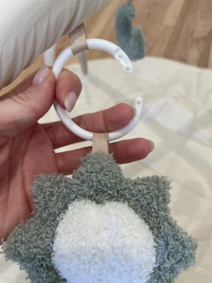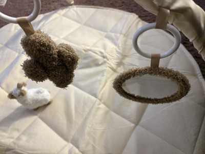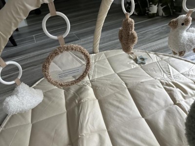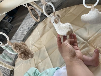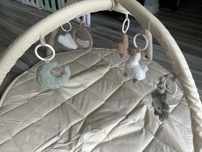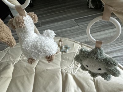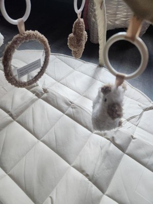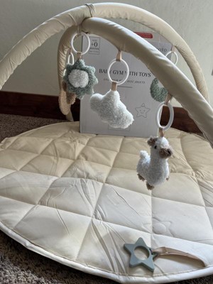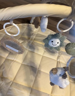 I love this play gym, the quilted pad is plush and soft. Neutral colors are appealing but the cute popping colors in the hanging toys are perfect! The toys are fuzzy and plush so the texture is very appealing. A cute chewy star toy is attached to the play mat as well!
