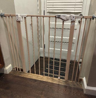 This baby gate is amazing. It fits perfectly at the top of my stairs. The color is such a pale pink, it's a great neutral. The door is quick and easy to open. It swings shut, but also has the option to stay open if need be. It's a really great quality gate.
