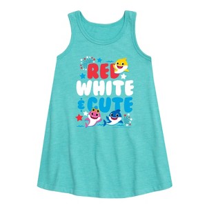 Baby Shark - Red White and Cute - Girl's Aline Dress - Sing along in style with Baby Shark graphic apparel, featuring vibrant and playful designs of Baby Shark, Mommy Shark, Daddy Shark, and the entire shark family. Each piece captures the fun, energy, and irresistible charm of the global hit song, bringing the colorful underwater world to life. Perfect for little fans and families who love to dance, sing, and make a splash with their favorite finned friends.